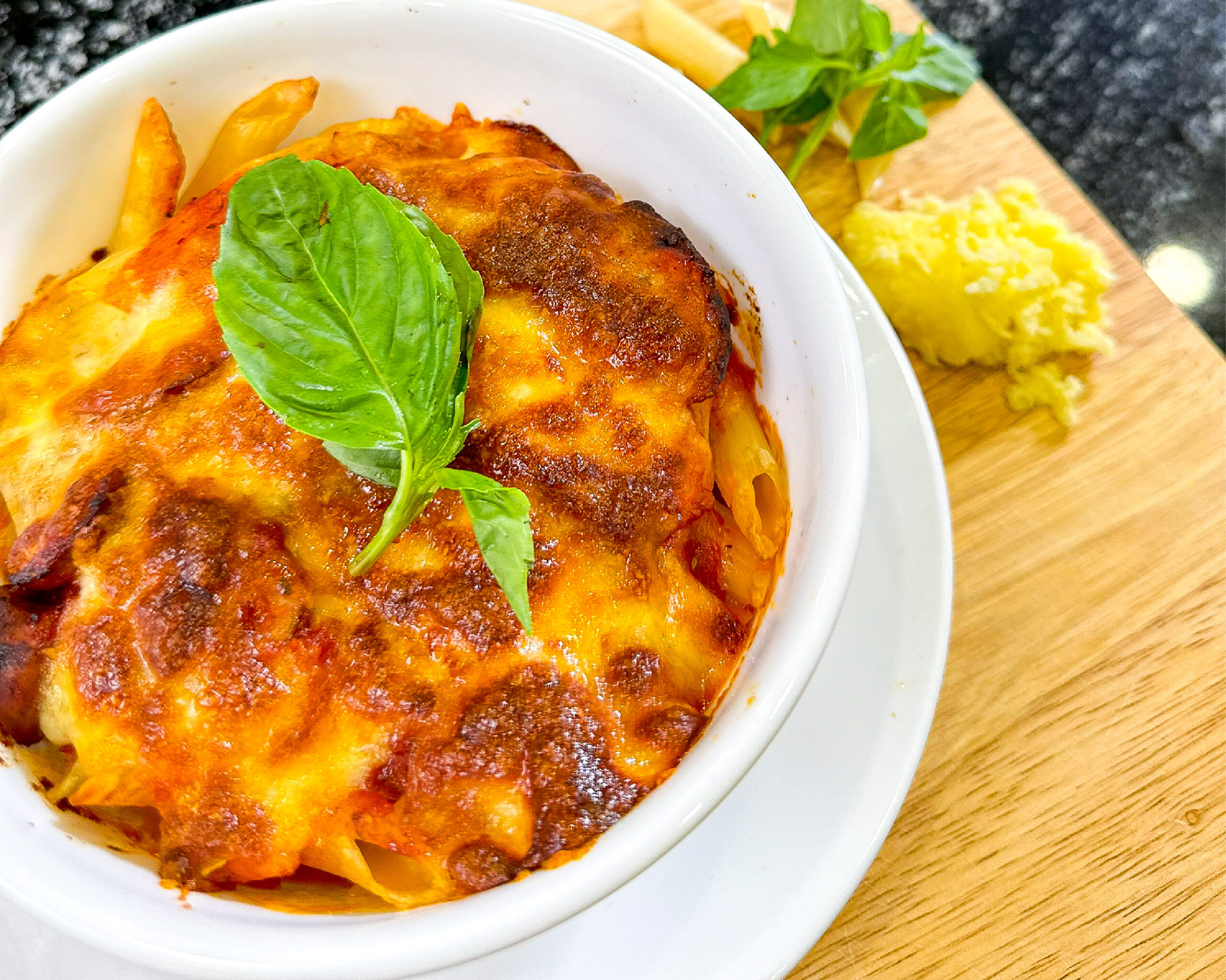 - Cho hỗn hợp mì ống và xúc xích vào hỗn hợp xốt. Nêm nếm vừa ăn và cho ra đĩa chịu nhiệt. Cho phô mai Mozarella lên trên.